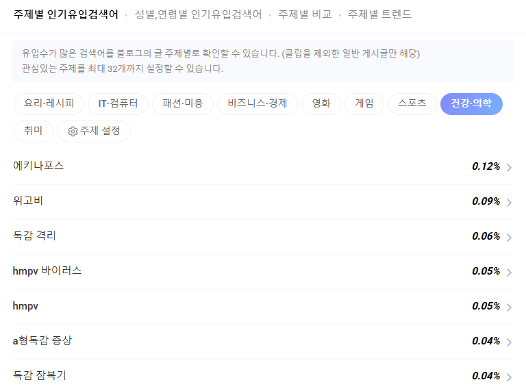 - 네이버 크리에이터 어드바이저 > 트렌드 메뉴에서 주제별 인기 검색어 확인