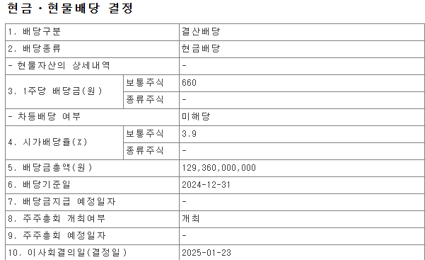 - 고배당 매력: 3.9%의 시가배당률로 시중 금리 대비 높은 수준