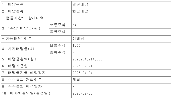 - 배당금액(4분기): 540원 / 지급일: 2025년 4월 4일