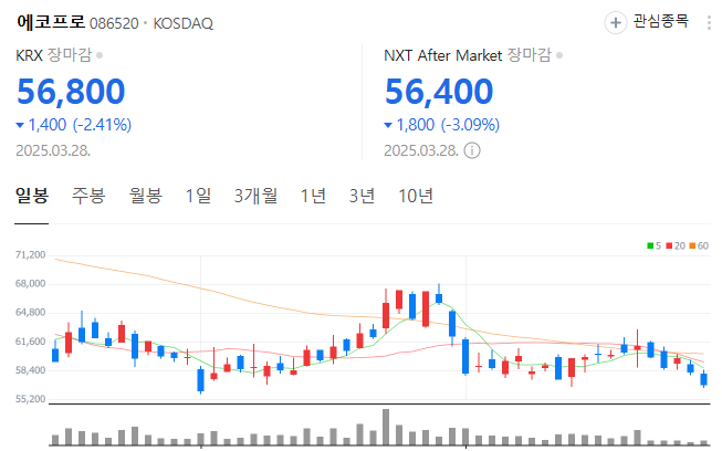 2025년 3월 28일 현재 에코프로의 주가는 56,800원을 기록하고 있으며, 최근 트럼프 정부의 관세 정책과 테슬라 주가 하락 등의 외부 요인으로 인해 주가가 다소 하락세를 보이고 있습니다. 전반적으로 2차전지 관련주가 약세 국면에 접어들며 에코프로 또한 영향을 받고 있습니다.