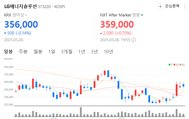 2025년 3월 28일 기준, LG에너지솔루션의 주가는 356,000원을 기록하고 있습니다. 이는 최근 3개월간 완만한 상승세를 나타내며, 전기차 산업 성장에 대한 기대가 반영된 결과입니다. 특히 3월 26일에는 구광모 회장의 발언에 힘입어 하루 만에 8% 급등하는 모습을 보여줬습니다. 또한 미국의 델타와의 파트너십으로 1조 원 규모의 공급 계약을 체결하면서 성장 기대감을 더욱 높이고 있습니다.