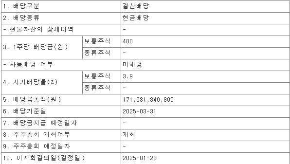 - 배당금 지급일: 주주총회일 이후 1개월 이내 (2025년 4월 예정)