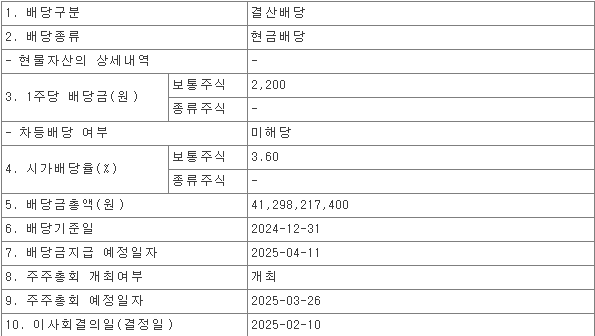 전년도 실적 덕분에 2024년에는 주당 2,200원의 배당이 예상되고 있습니다. 앞으로 실적이 회복된다면 배당금도 지속적으로 증가할 가능성이 있습니다.